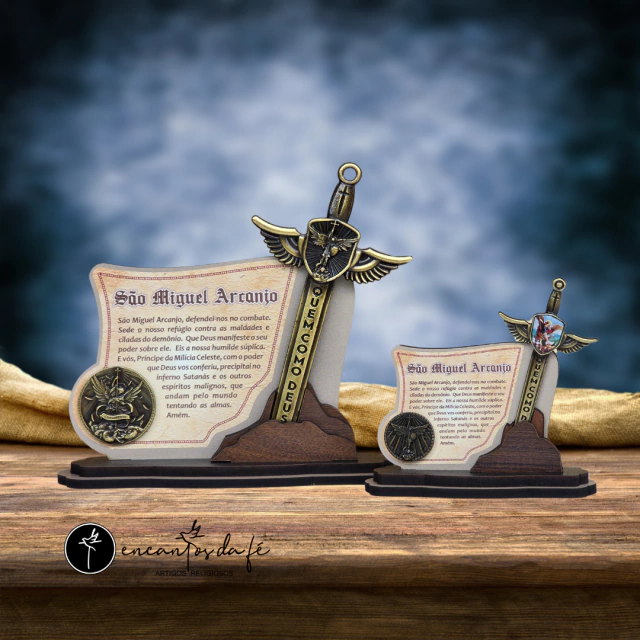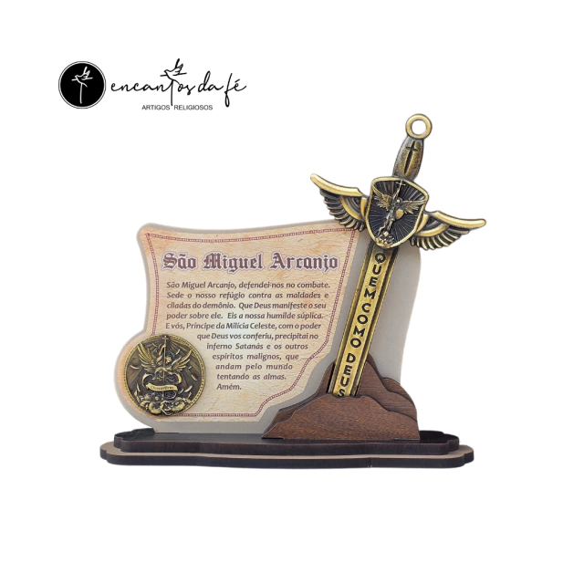 Adorno de Mesa São Miguel Arcanjo é uma peça única que traz proteção e charme para o seu ambiente. Feito em MDF, este adorno apresenta uma medalha e uma espada em metal com banho ouro velho escovado, garantindo durabilidade e beleza.