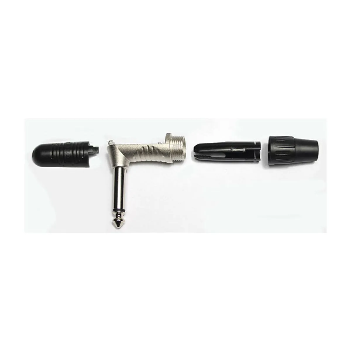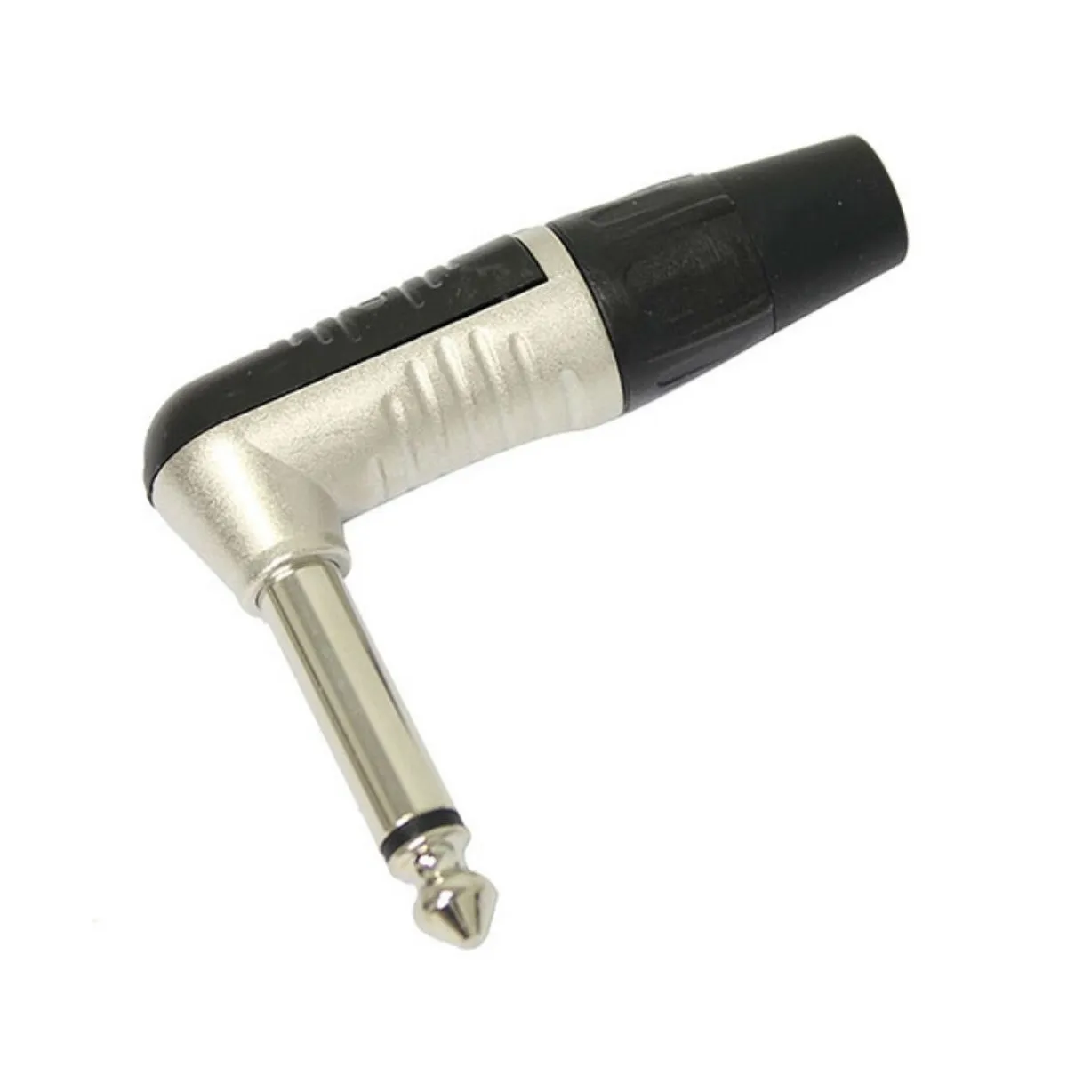 Conector P10 macho angulado (90º) de cabo com 2 pólos (mono) e corpo em níquel. Contatos também em níquel. (conectores desmontados e embalados individualmente).