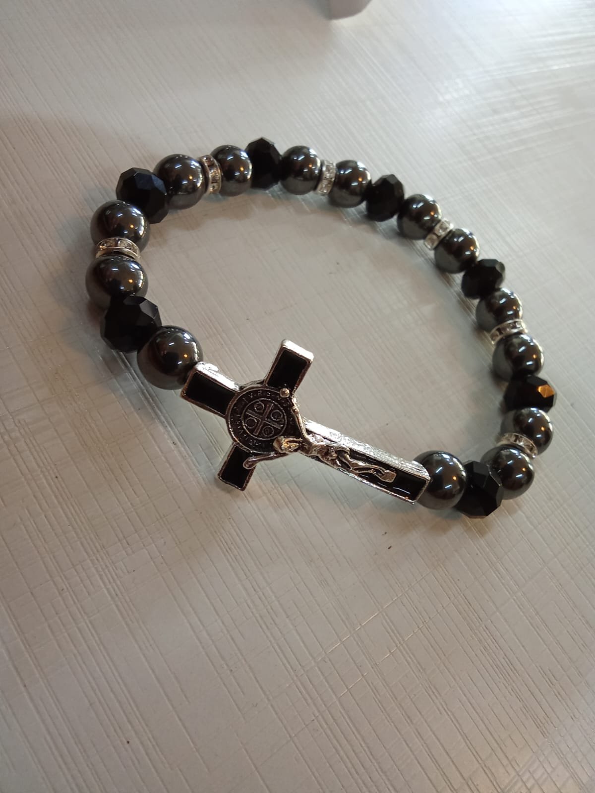 MATEIAL HEMATITA E CRISTAL E CRUZ COM SAO BENTO.