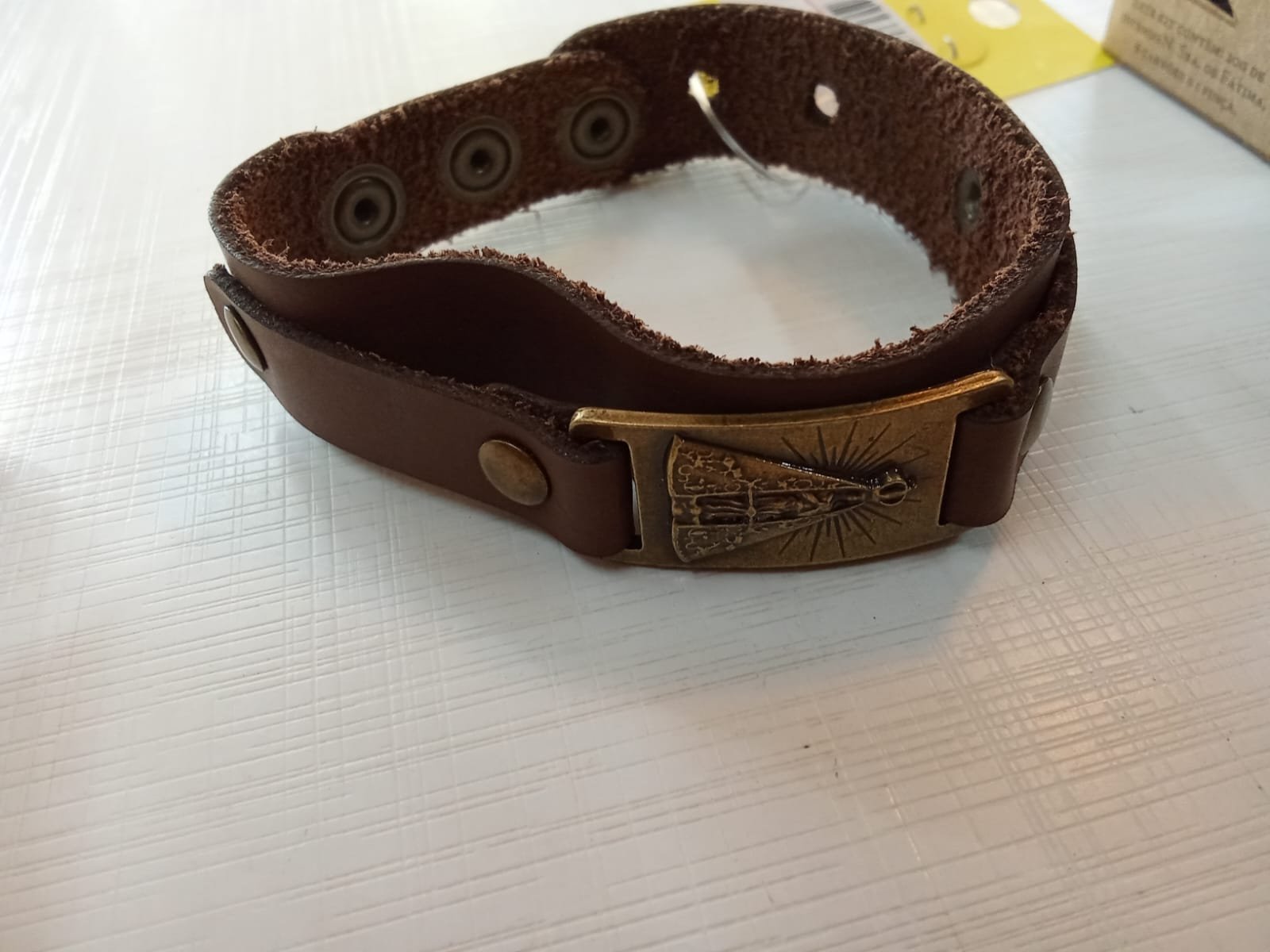 MATERIAL EM COURINO, MEDALHA EM METAL, COR MARROM.