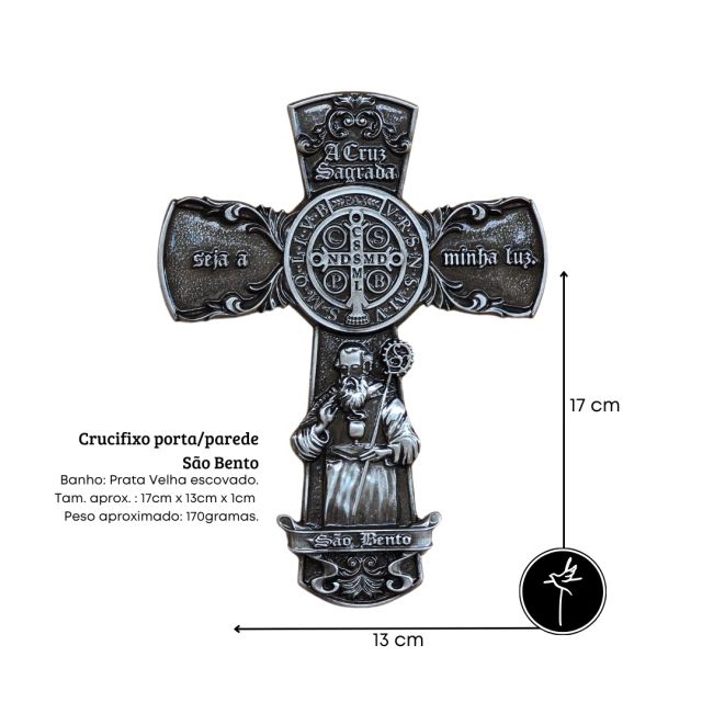 Descubra o Crucifixo de São Bento, uma peça encantadora que traz um toque de fé e proteção para o seu lar. Com medidas de 17cm x 13cm x 0,8cm, este crucifixo é confeccionado em metal e apresenta um sofisticado acabamento em prata velha escovado, que adiciona um charme rústico e elegante ao ambiente.